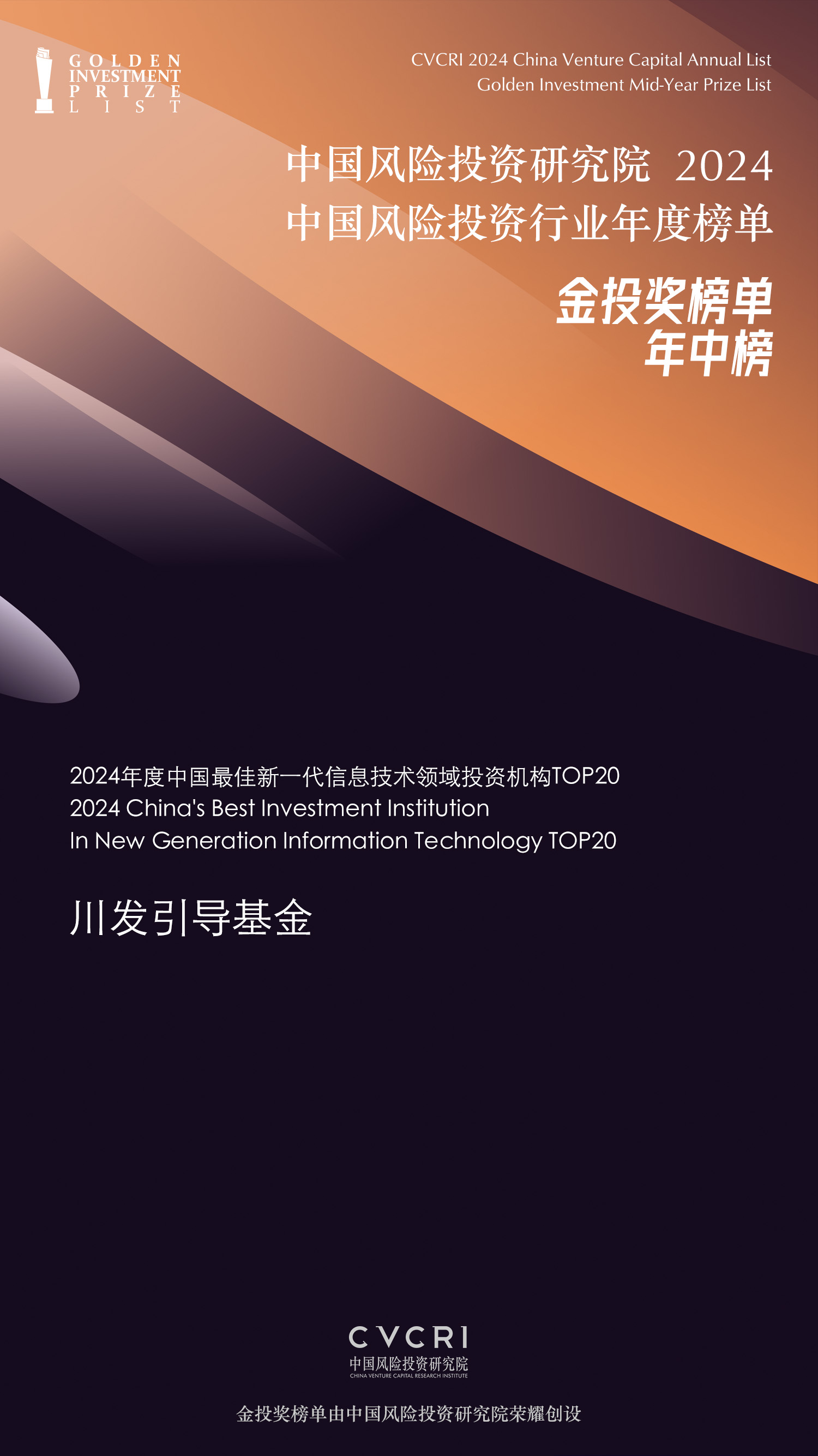 榮譽(yù) | 川發(fā)引導(dǎo)基金蟬聯(lián)榮登CVCRI金投獎(jiǎng)?2024中國風(fēng)險(xiǎn)投資行業(yè)年中榜