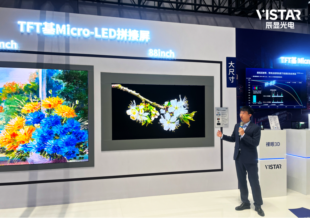 同日,辰顯光電還重磅發(fā)布了新一代88英寸P0.5TFT基Micro-LED拼接屏。該款產(chǎn)品支持10bit色深,可呈現(xiàn)高達(dá)10.7億種絢麗色彩,比傳統(tǒng)8bit屏幕提升256倍,色彩表現(xiàn)更鮮活、更逼真。搭載辰顯光電自主研發(fā)的Micro-LED專用驅(qū)動IC,畫面流暢護(hù)眼,視覺更舒適。屏幕采用國際領(lǐng)先的25微米Micro-LED芯片,并通過頂尖的巨量轉(zhuǎn)移工藝,精確地將3300萬顆LED完美拼接,實現(xiàn)了高達(dá)99.995%的良率。再加上DCI-P3 99%廣色域、2000nits峰值亮度、26000:1超高對比度和3%超低反射率,配合全球領(lǐng)先的混Bin技術(shù)2.0,畫面均勻性和色彩一致性達(dá)到巔峰,帶來前所未有的生動、流暢和沉浸式視覺享受,重新定義了視覺體驗的極限,為高端商顯市場和多場景應(yīng)用提供了更優(yōu)質(zhì)的解決方案。